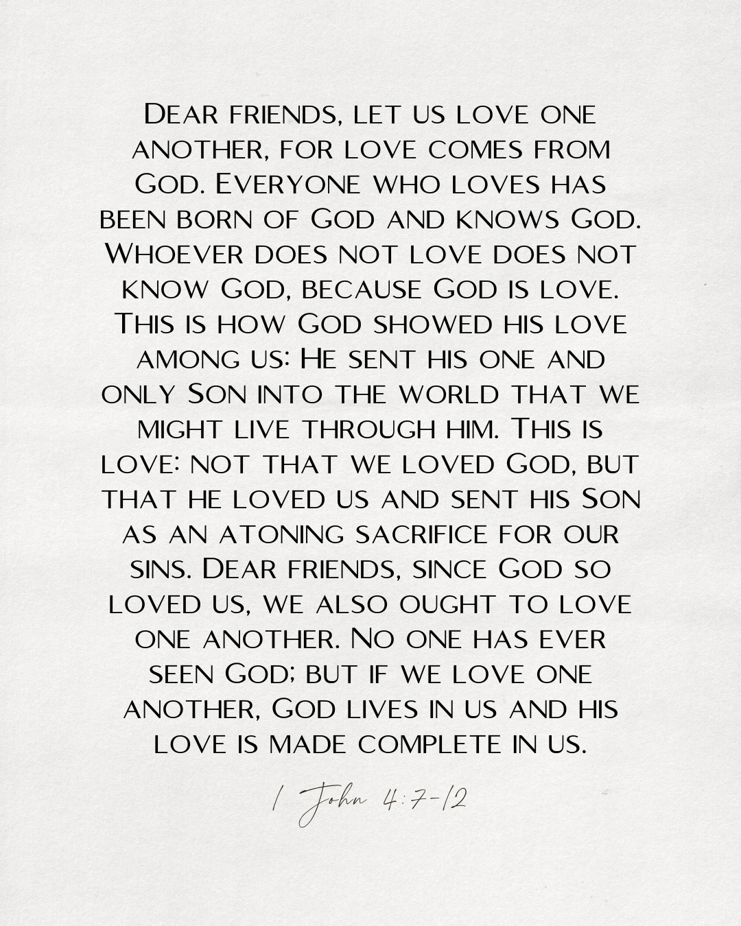 Love is patient, love is kind. It does not envy, it does not boast, it is not proud. It does not dishonor others, it is not self-seeking, it is not easily angered, it keeps no record of wrongs. Love does not delight in evil but rejoices with the truth. It always protects, always trusts, always hopes, always perseveres.
