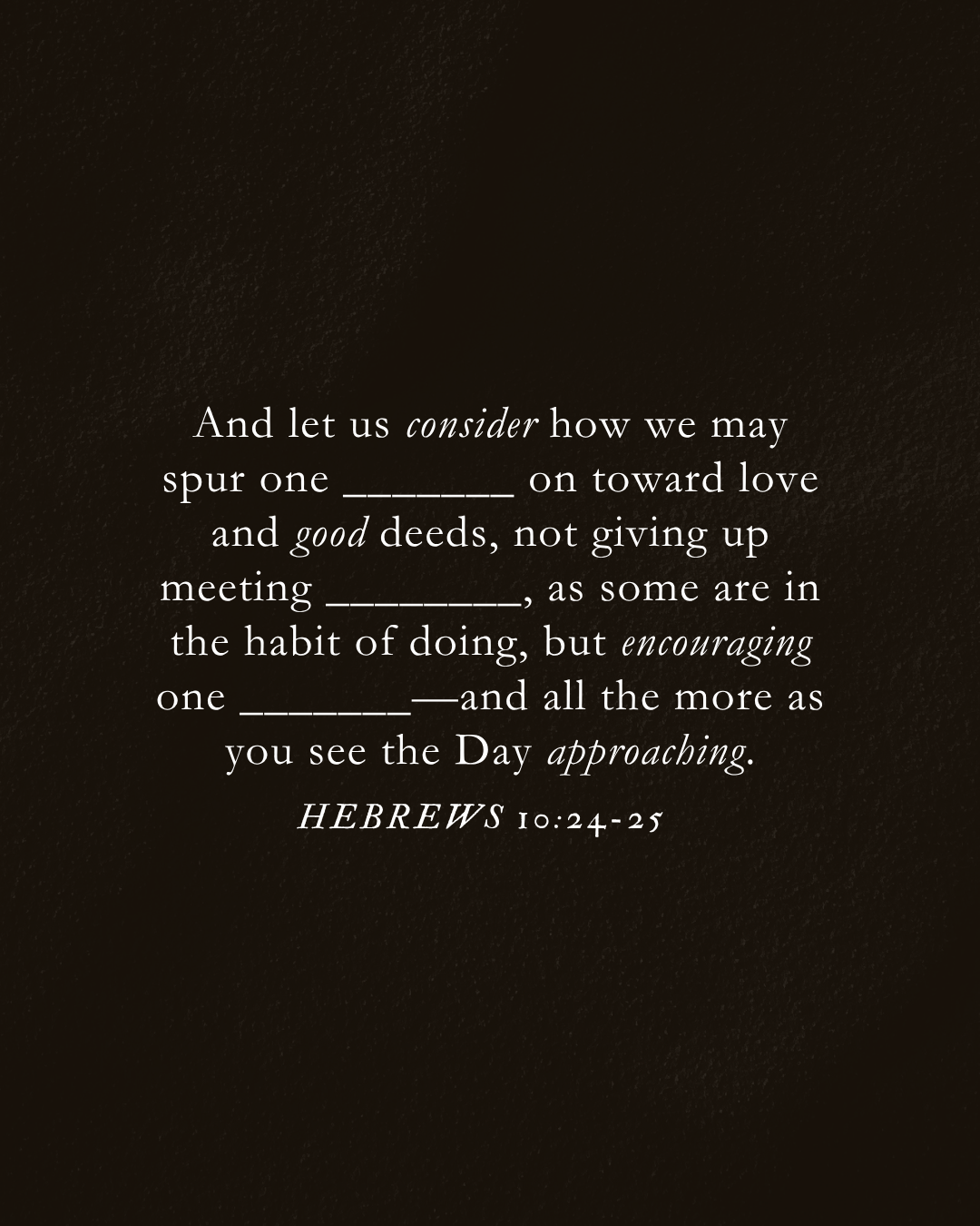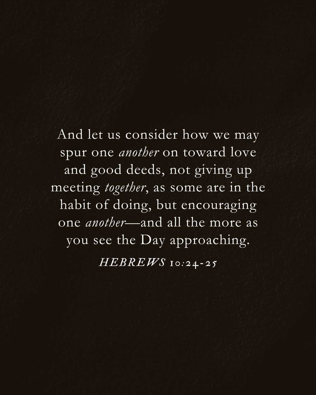 Consideremos cómo estimularnos unos a otros al amor y a las buenas obras, no dejando de congregarnos, como algunos tienen por costumbre, sino exhortándonos unos a otros, y mucho más al ver que el día se acerca.