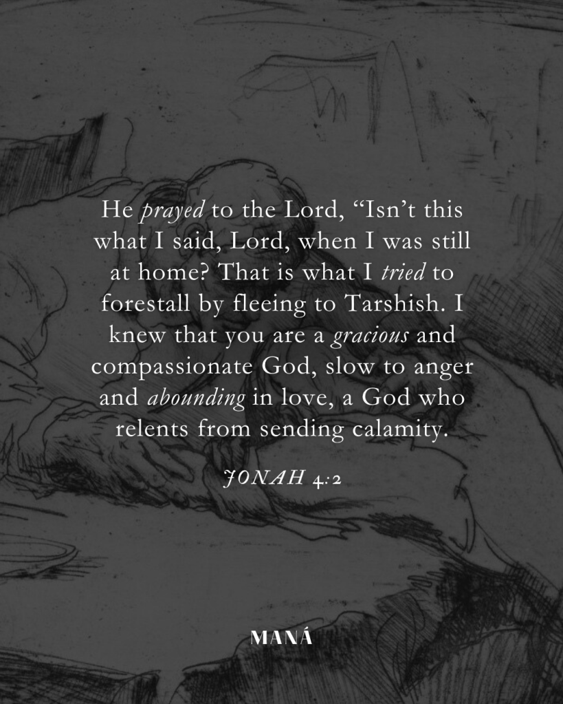 But to Jonah this seemed very wrong, and he became angry. He prayed to the Lord, “Isn’t this what I said, Lord, when I was still at home? That is what I tried to forestall by fleeing to Tarshish. I knew that you are a gracious and compassionate God, slow to anger and abounding in love, a God who relents from sending calamity. Now, Lord, take away my life, for it is better for me to die than to live.”