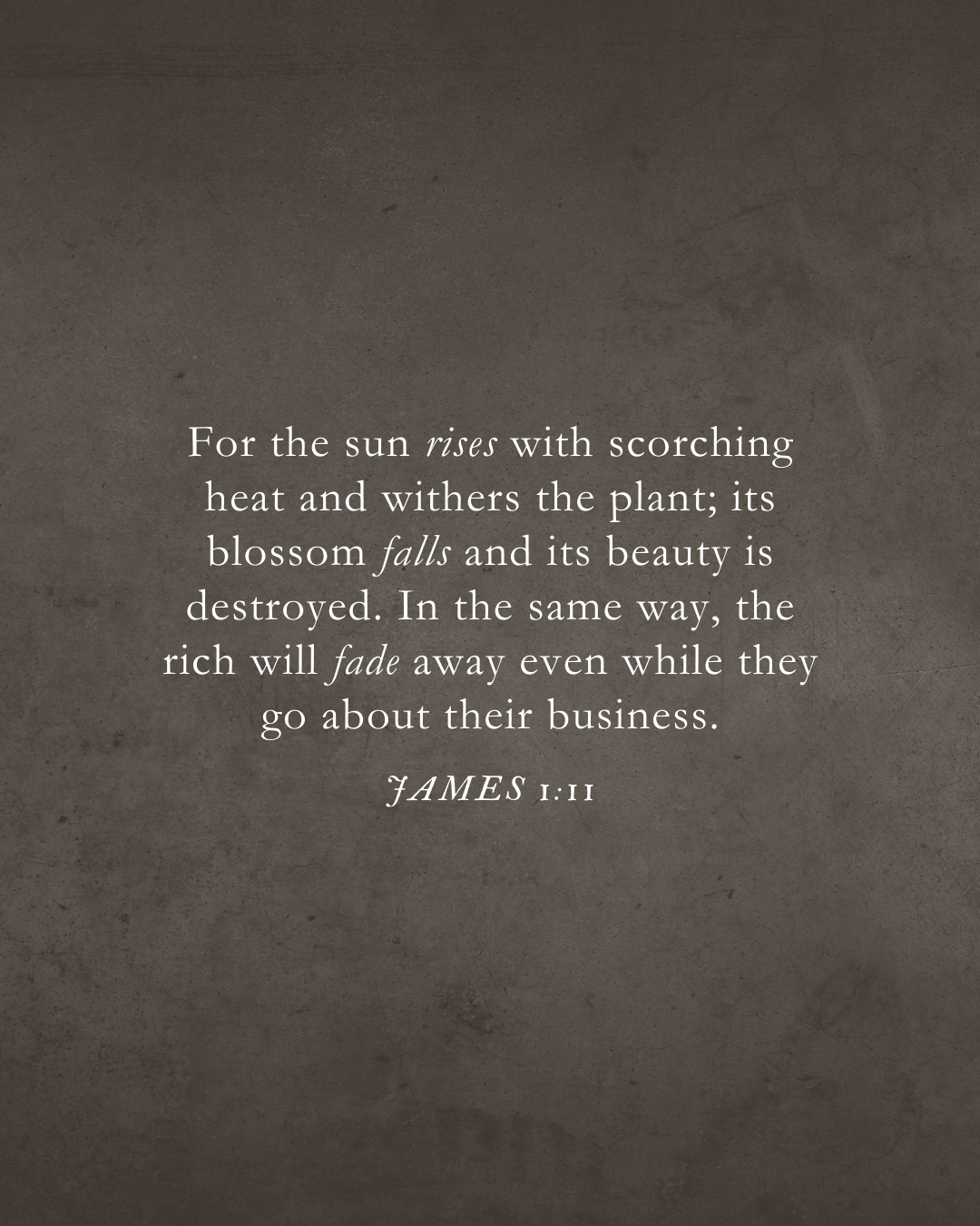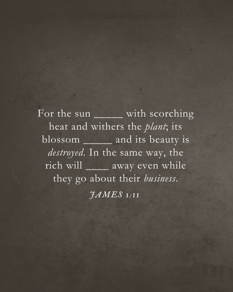 Le soleil se lève, sa chaleur devient brûlante, et la plante se dessèche, sa fleur tombe, et toute sa beauté s’évanouit. Ainsi en est-il du riche : il disparaîtra au milieu de ses activités.