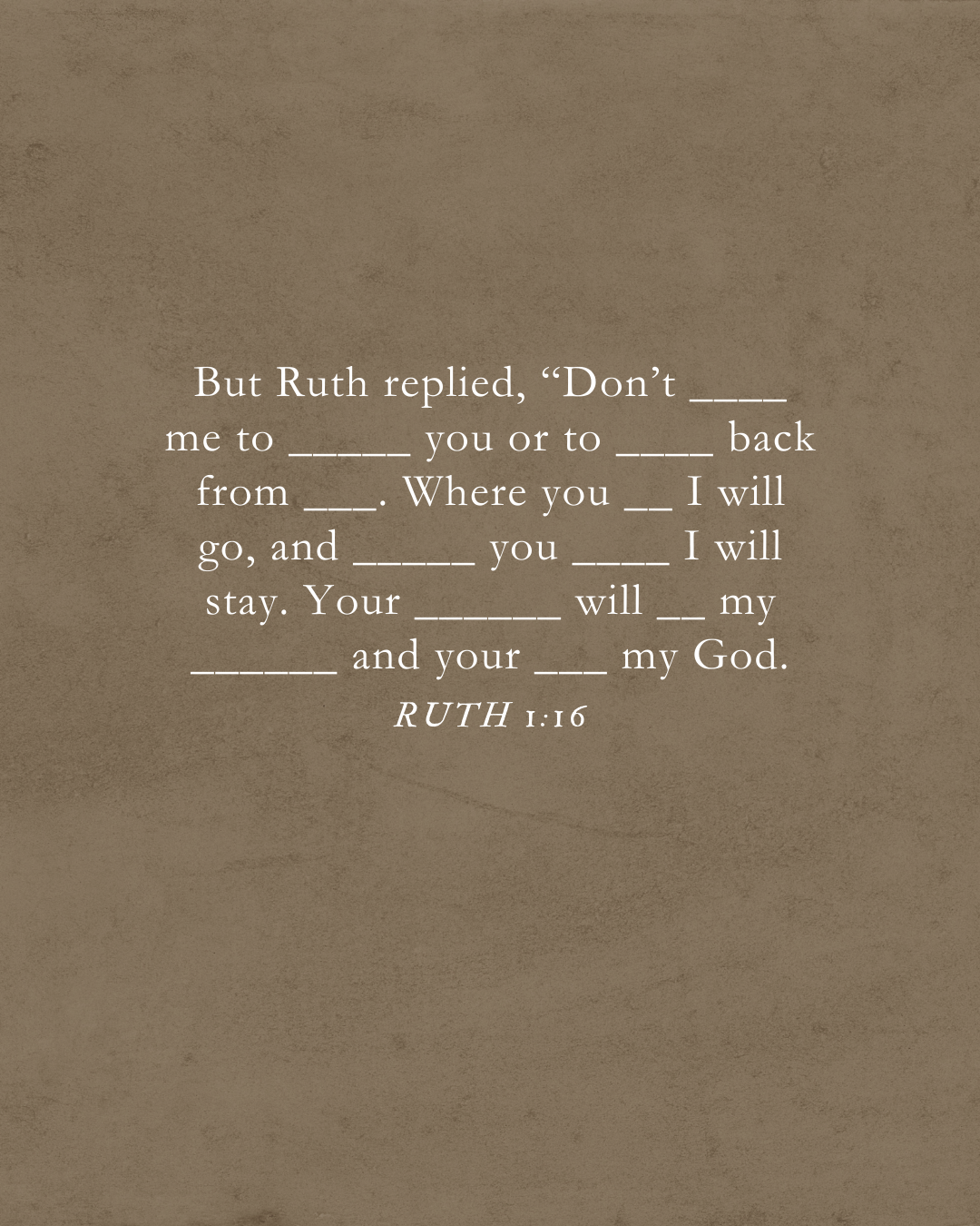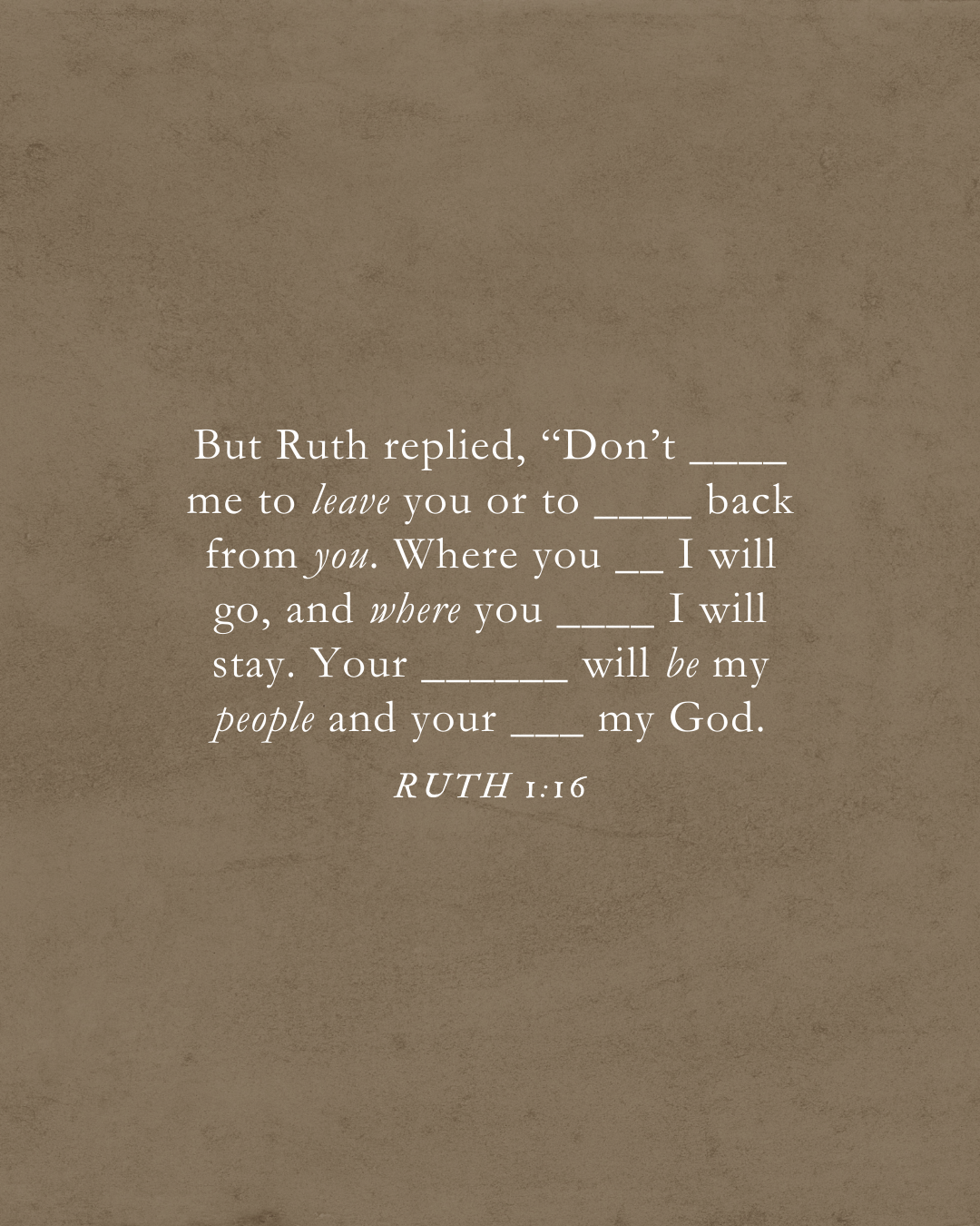 Ngunit sinabi ni Ruth, “Huwag mo akong pakiusapan na kita’y iwan, o talikuran ko na ang pagsunod sa iyo! Kung saan ka pupunta ay doon ako pupunta; kung saan ka nakatira ay doon ako maninirahan; ang iyong bayan ay magiging aking bayan, at ang iyong Diyos ay aking Diyos.