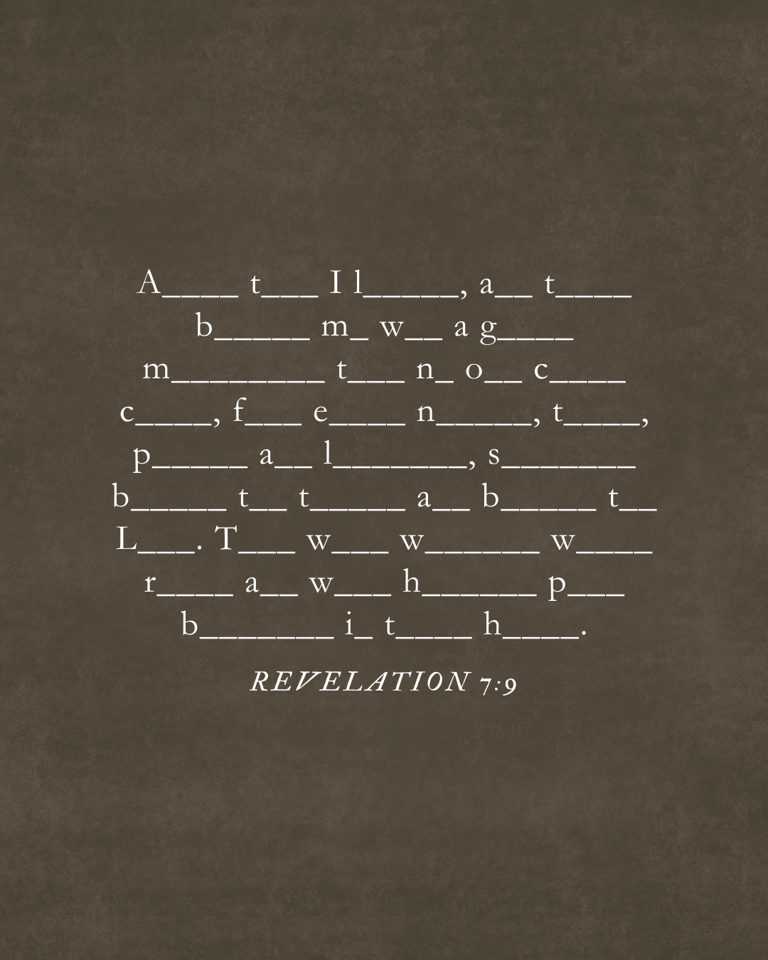 Después de esto miré, y vi una gran multitud, que nadie podía contar, de todas las naciones, tribus, pueblos, y lenguas, de pie delante del trono y delante del Cordero, vestidos con vestiduras blancas y con palmas en las manos.